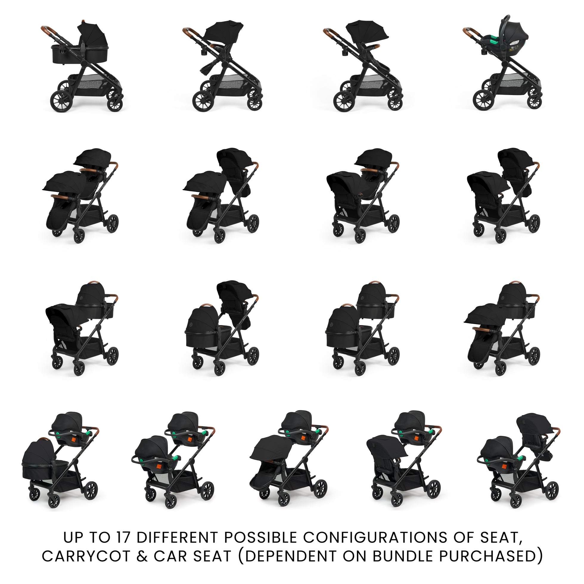 - Up to 17 different possible configurations of seat, carrycot and car seat (dependent on bundle purchased)