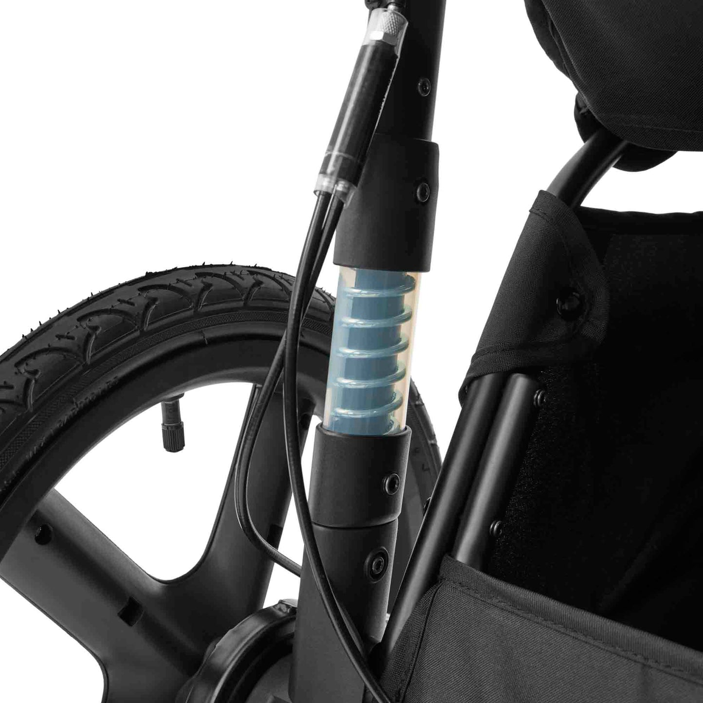Tackle any surface with three air-filled tyres and rear suspension.
